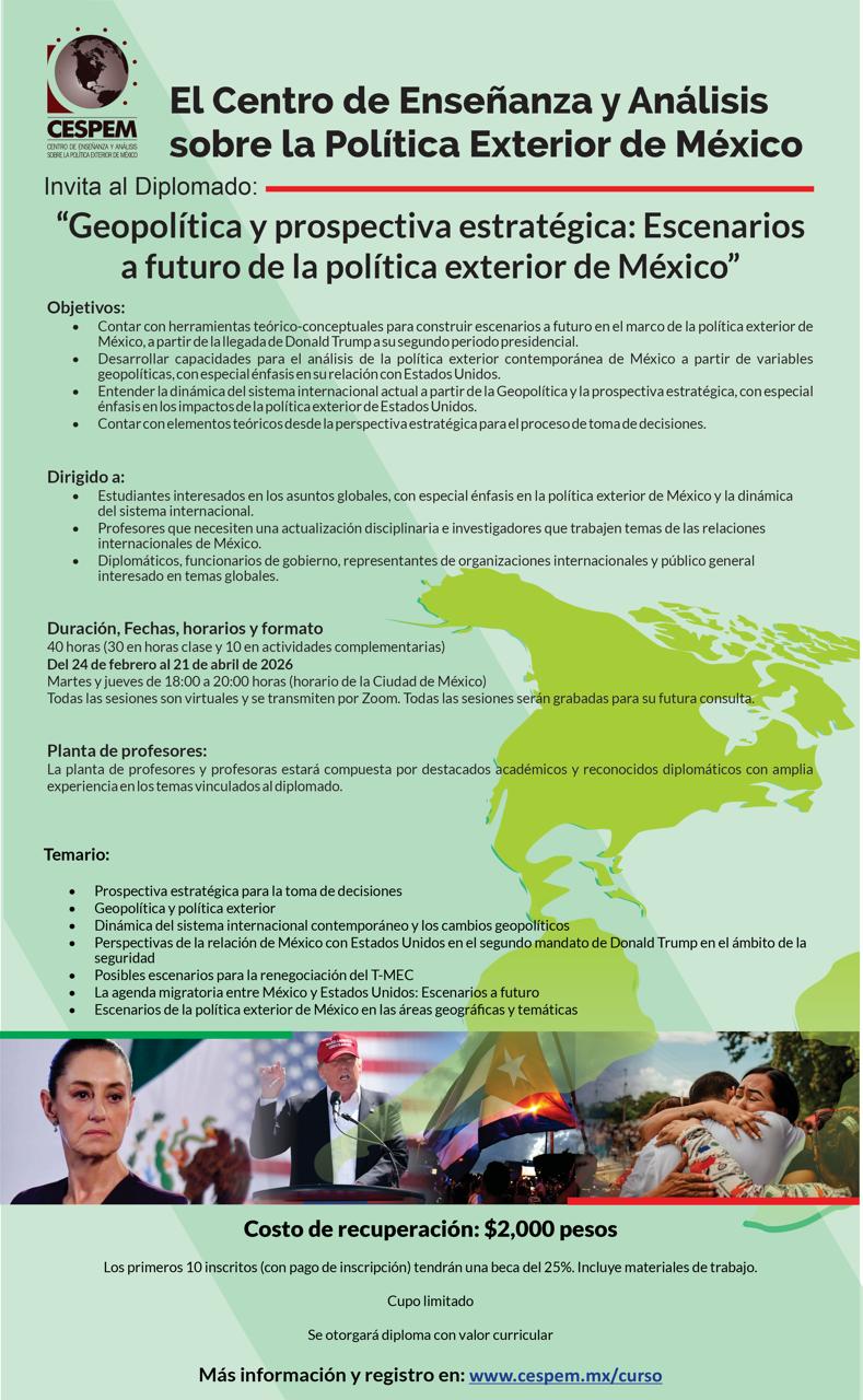 El Centro de Enseñanza y Análisis sobre la Política Exterior de México (CESPEM) invita al diplomado “Geopolítica y prospectiva estratégica: Escenarios a futuro de la política exterior de México”.